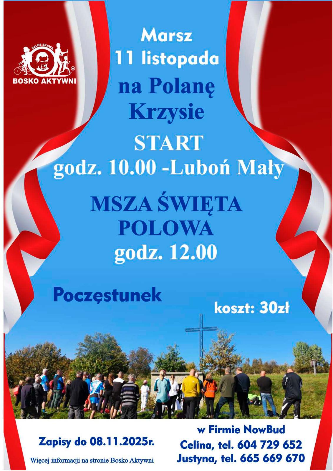 Witamy wszystkich Bosko Aktywnych🤗. Drodzy Przyjaciele i Młodzież 🙂🙂organizujemy Marsz na uczczenie Święta 11 listopada 🚶🏻🚶‍♀🚶🏻🚶‍♀🇵🇱 wyruszamy spod parkingu ze starej zakopianki „Luboń Mały „ (szlak niebieski) tj. za światłami w Skomielnej Białej parking na zakręcie 😎dojazd we własnym zakresie 🚘🚎start o 10.00 🚶🏻🚶‍♀następnie Msza Św. Polowa (12.00) 🙏🇵🇱🙏a później poczęstunek, biesiada i śpiewanie pieśni patriotycznych 🥁🎸🎤🇵🇱Zapewniamy ciepły poczęstunek 🍲🍖☕ proszę zgłaszajcie się żebyśmy wiedzieli jak się przygotować 🤗🙂🤗!!